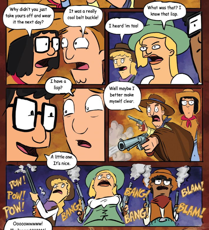 Whatever charms were present in Bob’s Burgers 1 and 2 have thoroughly worn off by this week’s third installment, which returns to the same parameters of the previous two to ever-diminishing returns. I’d probably be inclined to dismiss the repetition as lazy, anyway, but the stories here felt especially derivative: Tina’s western utterly fails to build any sense of drama (or emotional investment in the non-drama), establishing Tina as the sharpest shooter in the west, then asking her to solve a problem with sharp-shooting; Bob’s Burger of the Day Ideas, once crammed with dozens of jokes, wastes its entire page on one lame joke; and Gene’s musical barely even bothers to rhyme this time around (and seems to rely even more heavily on sound this month than previously). My fondness for these characters goes a long way, but it really felt like this issue wasn’t even trying. Were you as disappointed with this as I was, Spencer?