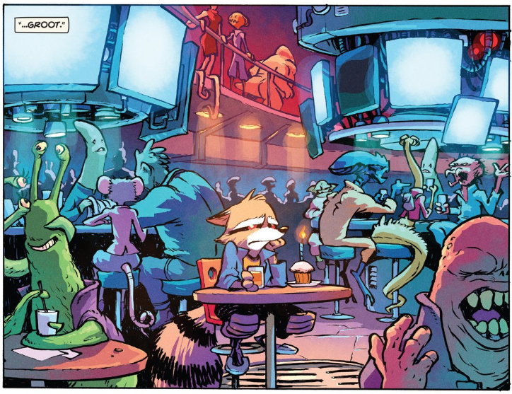 Young and Parker have a lot of tricks up their sleeves that they use to convey story without words, such as surprisingly effective gestures and body language, but I’m most stunned at how clearly the one panel above tells a story. Rocket looks absolutely despondent, all by himself with that pitiful little birthday cupcake, but the way the rest of the bar patrons are all gathered together in large groups situated off to the side, isolating Rocket in the center of the panel, makes him look even more alone. Even colorist Jean-Francois Bealieu gets in on the action; all the other patrons are bathed in bright colors from various light sources, but Rocket is colored more naturally, which makes him stand out like he’s in a spotlight. It’s an amazingly effective way to kick off the plot, and to be honest, I don’t think there’s any way dialogue could improve this panel at all.