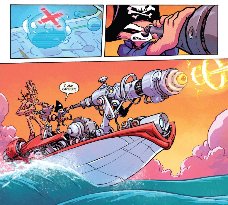 I’d actually like to suggest silent issues are some of the most telling about the central character: Sin City‘s “Silent Night” is about what Marv is willing to do to protect the innocent, Batman and Robin 18 is about Bruce’s grief in the wake of his son’s death, Spy vs. Spy is about how much those two just fucking hate each other. Here, we get a surprisingly thorough and concise statement of who Rocket is — he’s totally motivated by greed, but is still loved by his friends. Like I said: it’s super sweet.