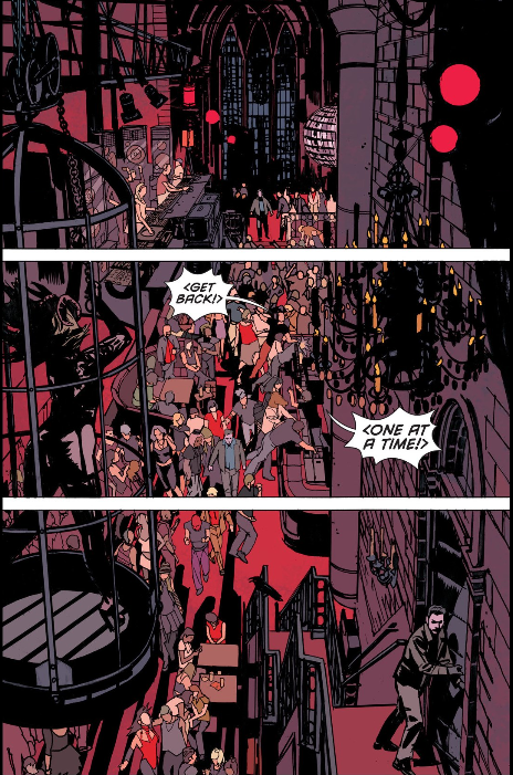 The colors by Leon and Dave Stewart change throughout the issue to reflect this clash as well. Where the airport is draped in a muted palette of earth tones, Grayson’s time at Club Hell is punctuated by a passionate red.