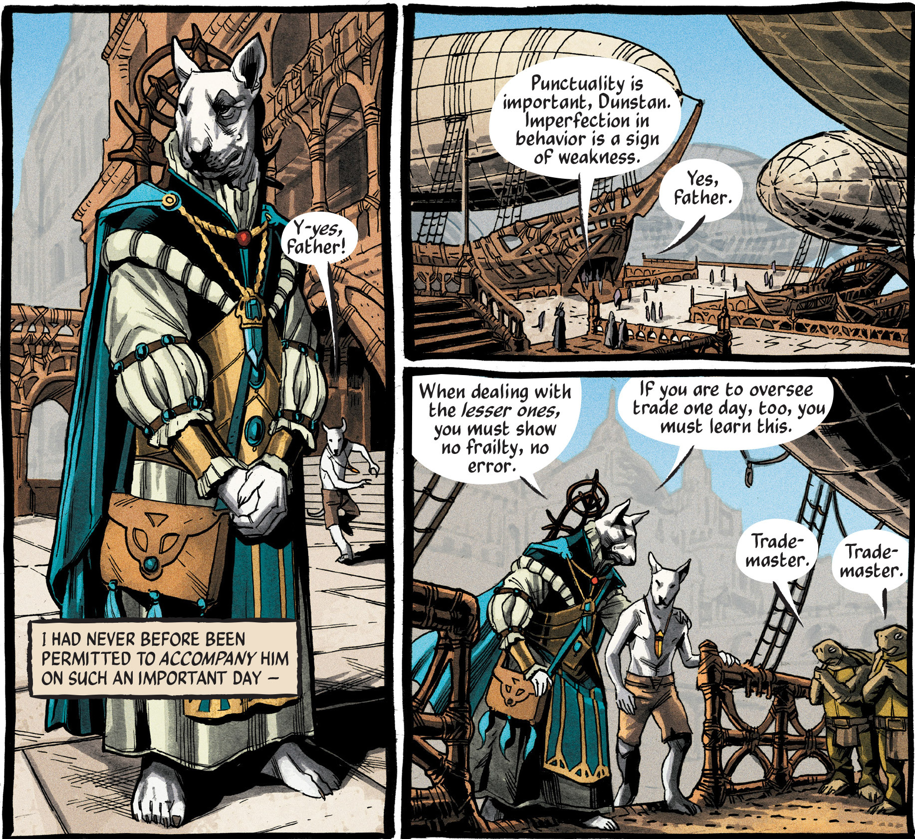 A lot of my excitement for that last page reveal came from history established over the past few years, but over in Tooth and Claw 1, Kurt Busiek and Benjamin Dewey are starting an entire world from scratch. We’re treated to an incredibly fascinating world with a status quo I could eagerly read about for ages, but comfortably stable societies aren’t exactly conducive to big adventure, and it’s not long before plans go awry and everything has changed, setting a young canine protagonist in the middle of a magical revolution. There are few writers I’d trust to create such an expansive universe and yet still make a new reader feel firmly at home, and Busiek is pretty much at the absolute top of the list. But he’s definitely not the only powerhouse creative on this title: Dewey proves that he belongs in the big leagues with incredible depictions of just about everything in these forty-something pages, with his art aptly perfected by Jordie Bellaire’s colors. Even the lettering, which I often appreciate but don’t spend much time thinking about, is fundamentally important in setting the tone in this issue, giving Tooth and Claw a bit of the European comics feel.