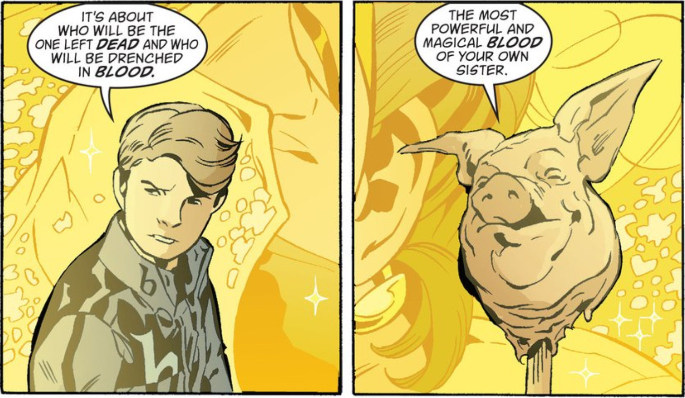Rose is visited by a monstrously complex vision, ranging from a jilted would-be lover to the physical manifestation of hope, but I think the most interesting is the head of Colin. Colin was the straw third of the three little pigs — itself a cautionary tale about lax preparedness — whose head appears on a pike in the vision. That allusion to Lord of the Flies was acknowledged openly when Goldilocks revolutionary forces first displayed his head 140 issues ago, but I think it’s telling that he appears in that form here. Boy Blue appears as his healthy younger self, not the shriveled corpse he left, telling us that Colin’s appearance was a conscious choice. Whether we care if that choice is made by Willingham, Colin himself, or whatever force allowed this vision to happen doesn’t matter — the point is, we’re going to see some kids kill each other.