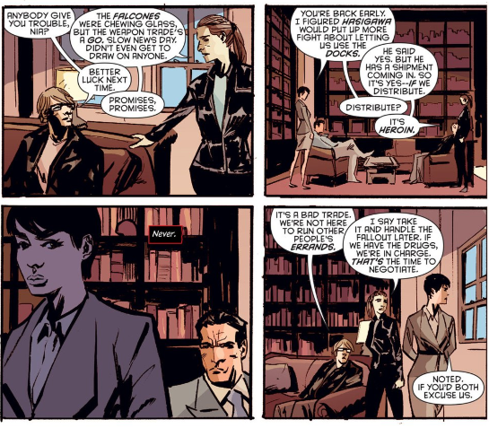 Selina Kyle is also a loner at heart, now making decisions for a large and increasingly complex crime network. The comparisons to Queen Elizabeth are apt; she has to contend with more workplace politics than most CEOs. Though I doubt that Selina can maintain this delicate balance for long. I’m impressed by Valentine’s handling of Selina so far, especially her inner monologue. She gives readers just enough detail to be intriguing. I like Selina’s role as almost an omniscient narrator, knowing more than the reader and hiding most of her intentions. Her initial reaction to the heroin shipment was so definitive, it contrasts abruptly with her acquiescence with the Yakuza’s demands a few pages later. In that way, readers mirror Eiko’s skepticism about Selina’s easy agreement to the deal.