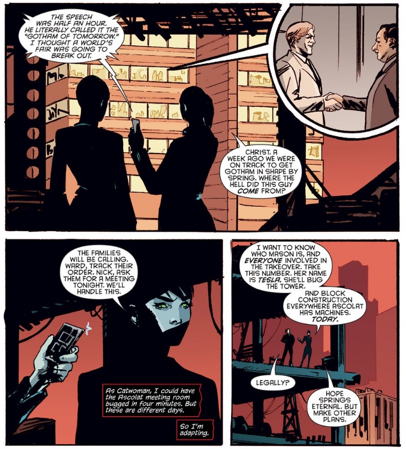 A very tentative read on her motives regarding the Ascolat Corporation: I believe that it speaks to Selina’s commitment to work the angles of a legalized-ish crime boss in two ways: