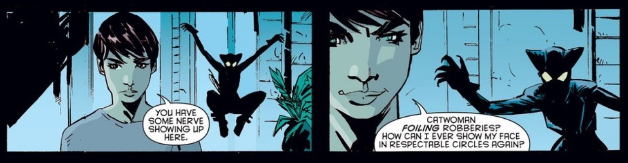 I think it speaks equally to Selina’s specific irritation of Eiko using her guise to complete work in Catwoman’s name because of her intentional remove from that guise as well as her using the Cat identity in the “wrong” way. After Selina’s dedication to the role of public figure and matriarch of the Calabrese Family over her very private and very personal statement of Catwoman (one whose purpose is very much at odds with her current work), she would feel irked if some young up and comer came and stole her identity without her permission or blessing.