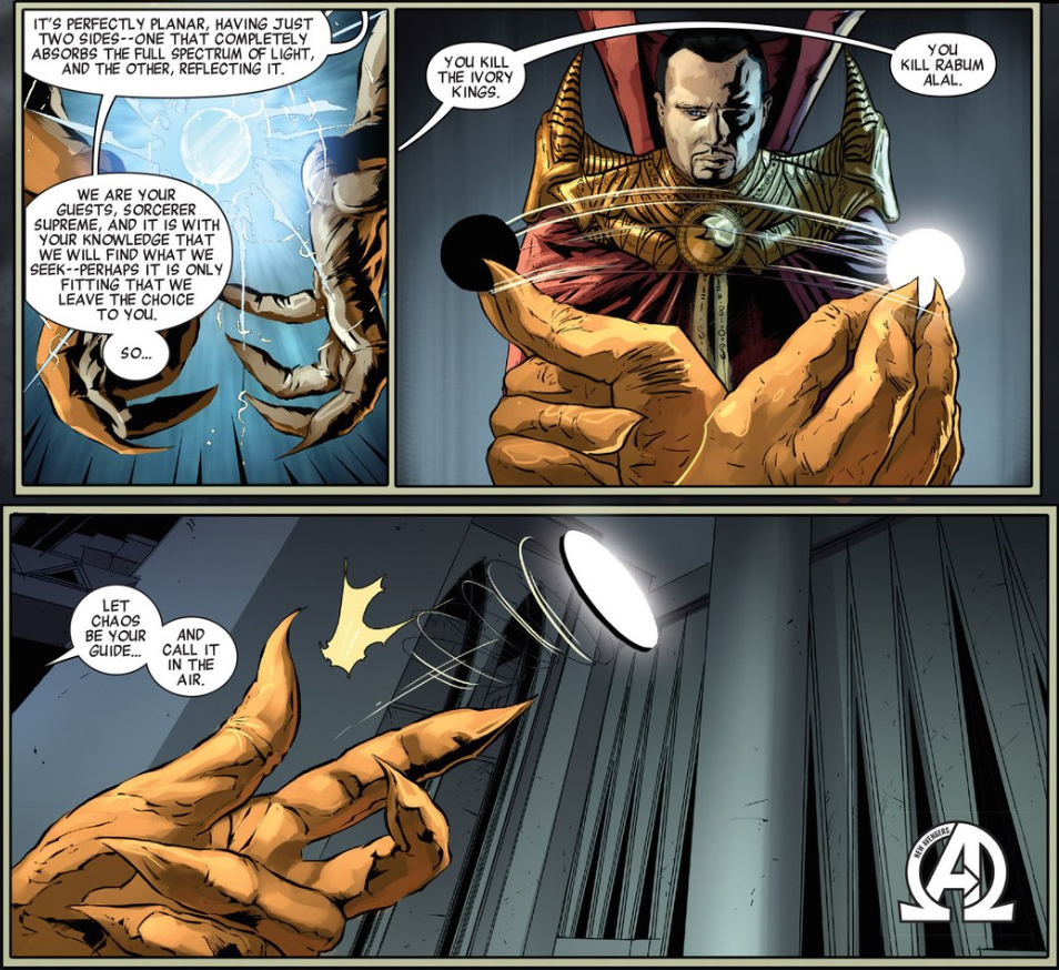 I guess Ex Nihili don’t have pockets for actual change, but that seems kind of cumbersome. (Also, if black means Strange gets the Ivory Kings, and white means he gets Rabum Alal, what exactly is he “calling”?) It’s just awkward enough to make its allegorical significance clear, but I really have no idea what it means. Morality is an arbitrary coin flip? I suppose that fits with the theme of the issue, but a coin flip still seems like a glib way to solve a problem in a series all about hand-wringing and belabored thought.
