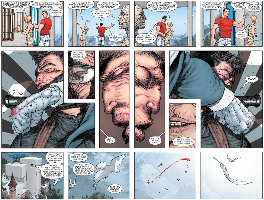 Fittingly, Quitely’s art is all about symmetry. Most pages are broken into an eight panel layout, continuing the motif of eight/the infinity symbol throughout the issue. The layout is also used to heighten the presence of Janus, the Roman god looking to both the future and the past, featured prominently in the story. A bust of Janus is even used as a murder weapon.
