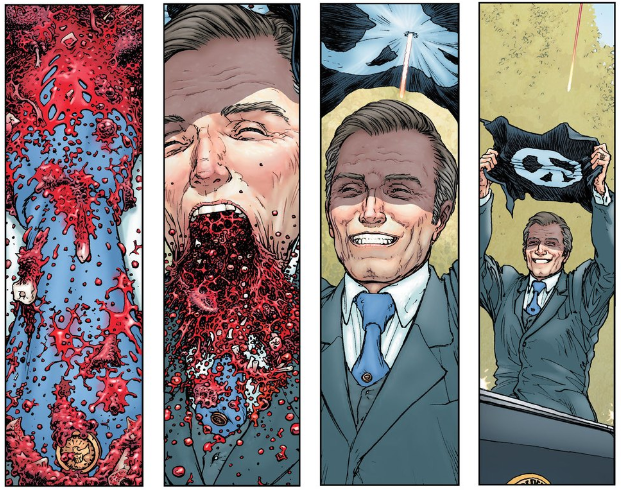 The issue is a little disorienting, as the story is told non-linerally. From the very beginning time is in play, as we experience Peacemaker’s assassination of President Harley in reverse. The second page in particular takes us from the bloody aftermath of the bullet’s destruction to the moment just before impact. Quitely’s hyper-realistic rendering of Harley’s viscera and teeth exploding onto his necktie makes a terrifying first impression.