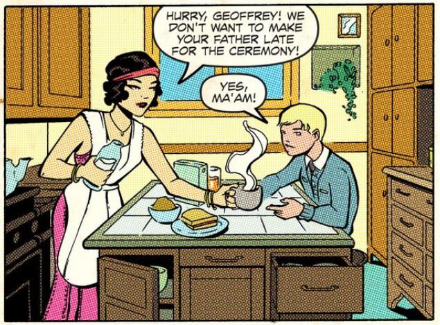 Is she still dressed up from the night before? Maybe she woke up at 3:30 in the morning so she can dress like this for breakfast. This is a silly little detail that almost reads like a mistake. Almost. Check out the rest of what’s going on in this panel — you won’t find a complete breakfast like this outside of a commercial for Kellogg’s products. Playing to the idea that all of this is in-universe propaganda, the characters and events aren’t representative of the truth, but representative of the collective story we all know and all share. Quick – what’s a 1920s woman look like? Good – don’t change that first thought at all: that’s who she is. What’s breakfast look like? Again, don’t you dare alter the first image that pops into your head -it’s coffee, juice, cereal, toast and a big jug of milk.