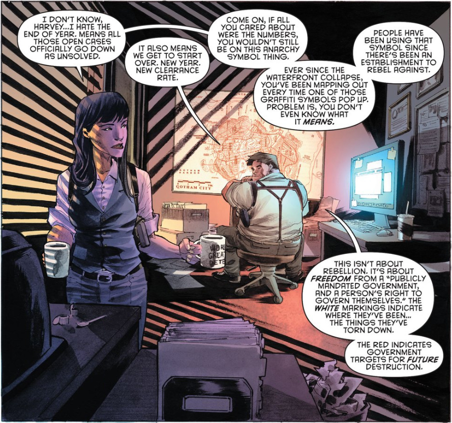 Meanwhile, in the months since the events of Detective Comics 34, Bullock continues to obsess over and investigate the anarchy graffiti symbols appearing all over Gotham. It’s been a particularly awful year in Gotham, with 617 618 murders so far and he’s ready to bring things to a close.