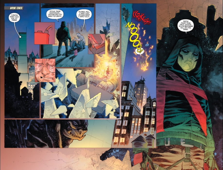 The issue opens with a mysterious person, wearing a jacket emblazoned with the letter A, setting Wayne Enterprises’ employee Jeb Lester on fire and kicking him out a window. We later learn that Lester is potentially involved in a human trafficking ring. There’s a new vigilante in Gotham, but as the cover tells us, one that promises to bring chaos to Gotham where Batman brings order.