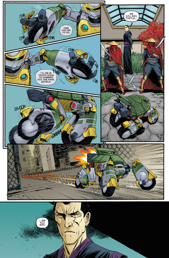 Lest you think multiple levels of deception and the end of the world are too grim topics for the Ninja Turtles to tackle, writers Tom Waltz, Bobby Curnow, and Kevin Eastman, along with artist Cory Smith, are quick to highlight the absurdity in the story they’re presenting. I can tell I’ve been reading comics too long, because the hilarity of the following totally escaped me at first: a robot, controlled remotely by a mutant turtle, negotiates with an ancient ninja master in his traditional zen garden. The team rapidly ratchets up the nonsense by making Metalhead transform into dune buggy mode right in the middle of a quintessentially melodramatic Shedder-ism.