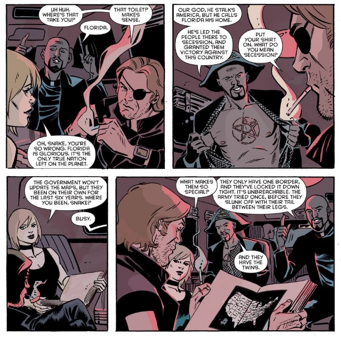 Florida, in a realistic turn of events, has seceded from the union and has lined their border with nukes in a deal they made with Cuba. Also — perhaps even less realistically — the state is run by psychic twins who are overseeing a lawless land full of murder and corruption. That’s a wonderful backdrop for this title and one that fits into the world created by Carpenter perfectly. True, this version of Florida does take a lot of it’s cues from the New York which gives this title its name, but that’s alright. Putting Snake back into his natural environment — chaos — is a good move.