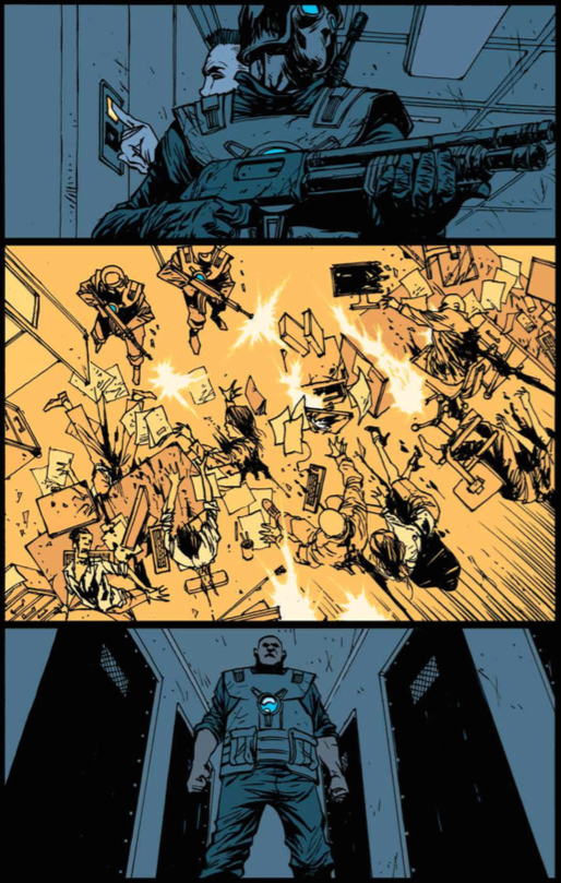 Patrick: He did! His whole fist, blowing past (and undoubtedly through) the teeth and into the back of the throat. I was so struck by the uber-ugly of this sequence that it was hard to see anything else. It’s like any great horror movie — daring the reader to witness everything the page has to offer. The aforementioned mouth-punching is the single most horrific thing that happens in the elevator, but it comes at the end of a knock-down-drag-out brawl — a patient game of gory escalation, that somehow outpaces the reader’s imagination without ever losing it. In fact, we sit in this fight for four whole pages without it being very gruesome at all; the initial action is all guns and rote close-quarters-combat. Ponticelli and Bellaire dish out a little bit of blood, but they’re clearly working within the confines of precision at this point. Notice how the very first move Zero makes is good and tactical.