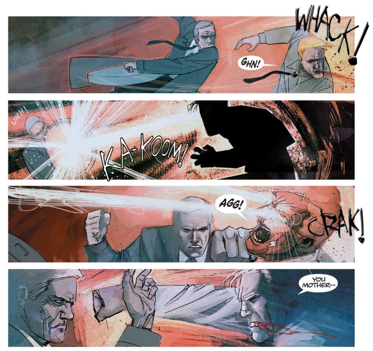 Again, this is another bravura sequence from Reis; the choreography and sense of movement is impeccable, but I’m most impressed by how intimidating Geoffrey comes across here. He’s getting older, he has no powers, but he handles Arclight with minimal hassle anyway. The fact that he can so effortlessly take down a super makes him all the more imposing, but also shows the audience why he is someone not to be crossed. If anyone in C.O.W.L. has any objection to Geoffrey’s actions, they’d better tread lightly.