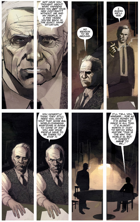 Drew: You know, if this were a lesser series, I might consider those pearls a hint that Geoffrey has been corrupt longer than this most recent contract negotiation, but I truly believe that Geoffrey wouldn’t go for run-of-the-mill embezzlement or bribes. We may not be able to trust everything in last month’s issue, but I think we know enough about Geoffrey to peg him as an ideologue now turning to crime only as a means to stay alive. Heck, that scene between him and Stone makes it crystal clear that he’s itching to be out of this deal as soon as possible. No, I think the pearls represent nothing other that Geoffrey’s picturesque life, with a patient, manicured wife, always ready for a photo op.