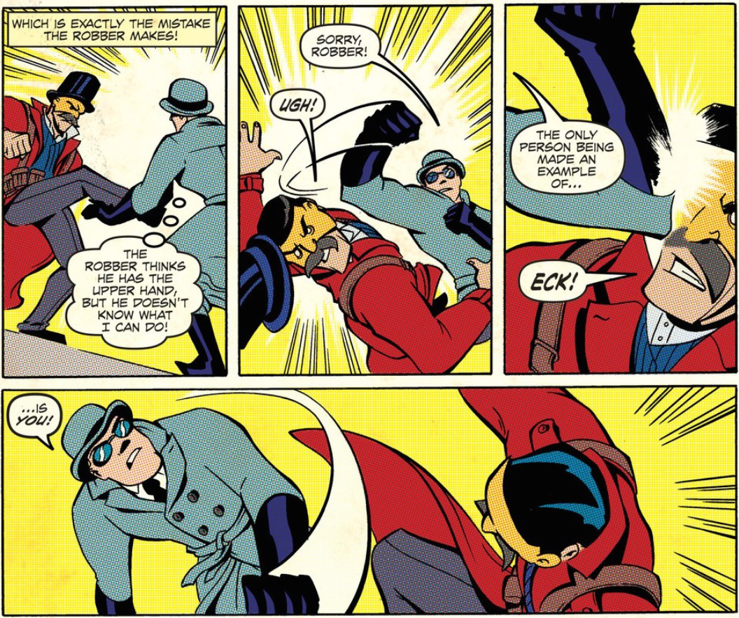 We’ve spent a lot of time praising the density of Cameron Stewart and Babs Tarr’s art in Batgirl, but that efficiency wouldn’t work without Maris Wicks’ thoughtful color choices clarifying every panel. Whether she’s piling on color to add detail to a setting or stripping it away to focus our attention, every move seems informed by a deft sense of the narrative. There were several bravura sequences that illustrate this skill, but none captured our attention quite as strongly as her careful deployment of yellow in the climactic fight scene of Batgirl 36.
