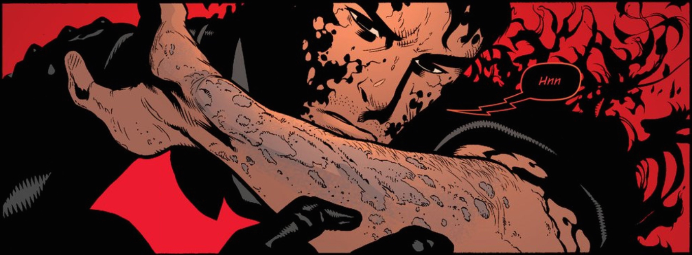 The colors on Batman and Robin have always subtly enhanced the mood, whether it’s the warmth of friendship or the cold detachment of grief, but John Kalisz found another gear as the story moved to the alien world of Apokolips. Bathing everything in a hellfire glow seems like the logical choice, sure, but Kalisz was very careful to keep those colors red — a color we very closely associate with Robin, bathing each panel in a potent reminder of exactly what it is Bruce is chasing.