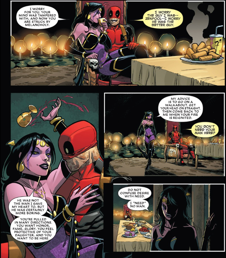 Sure, it seems like she’s trying to persuade Deadpool to do what’s best for himself by going on a walkabout, but the implied subtext is that she wants Wade to find his old self. There’s a problem with that, however. Wade wants to be more than his old self. Zenpool showed Wade what he could be, and while he might not want to be exactly Zenpool, he did enjoy actually being a decent human being for once.