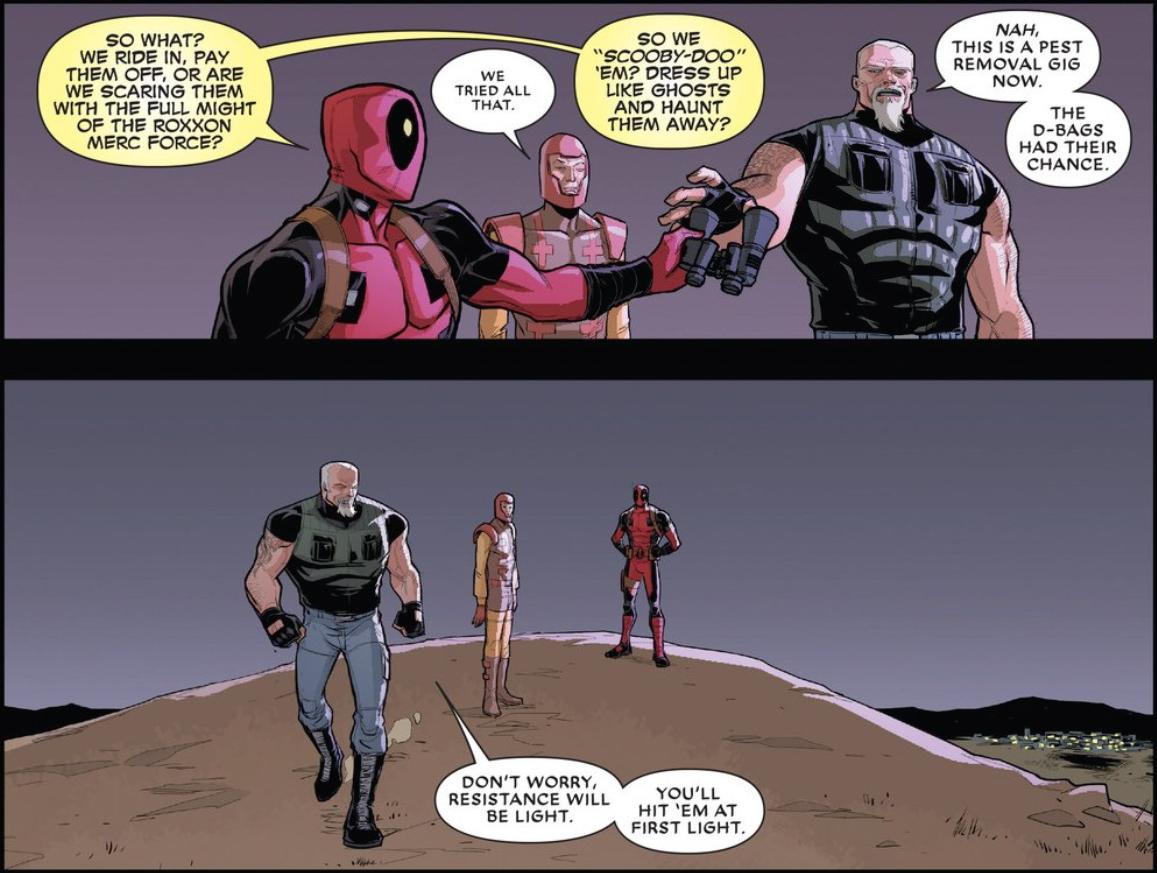 Deadpool is sad you guys! Previously, Deadpool existed as the Zen version of himself — a self which in many ways he feels is better than the Deadpool we all know and love…er, tolerate. This has caused Wade to feel a bit out of sorts. On the one hand he wishes he was more Zen, but on the other, it’s more fun and sexy to be regular Deadpool. Unable to finds answers to his questions, Deadpool sets off to the Middle East to work a job protecting oil refineries for the Roxxon Corporation. There, he quickly rebels against his employers, saving a town and maybe getting himself into a whole mess of trouble.