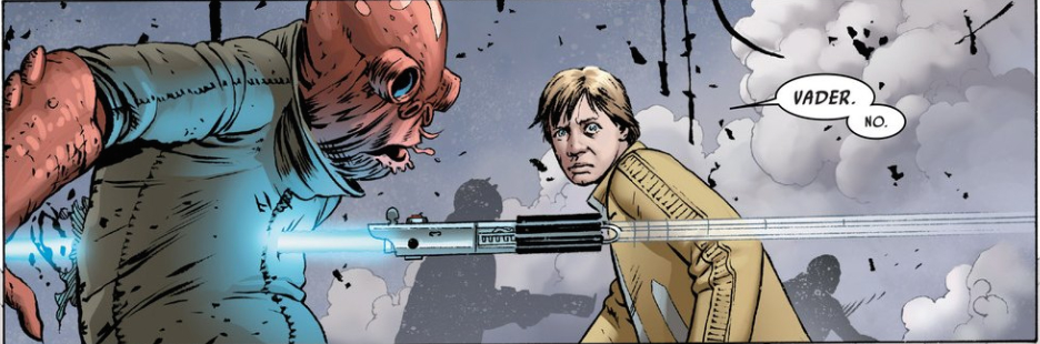 My biggest sigh of relief came early, during that Luke / Vader confrontation. Taylor’s right to point out that part of what makes it so fun is that Luke is in way over his head. Vader delights in this fact. I absolutely love that Luke throws down a line of dialog that echoes something he’ll say in Empire, telling Vader that he killed his father. “No, I am your father” is the utlra-iconic line we can’t but expect see in response, but Aaron’s version of the character delivers the amazingly satisfying “I’ve killed many fathers. You’ll have to be more specific.” That’s unspeakably bad-ass. Plus, it puts both Luke and the reader off kilter, as we both try to figure out how to deal with what was just said. Our reasons for being thrown by the line are different, but in that moment, we’re both just dumbfounded at Darth Vader’s evil awesomeness.