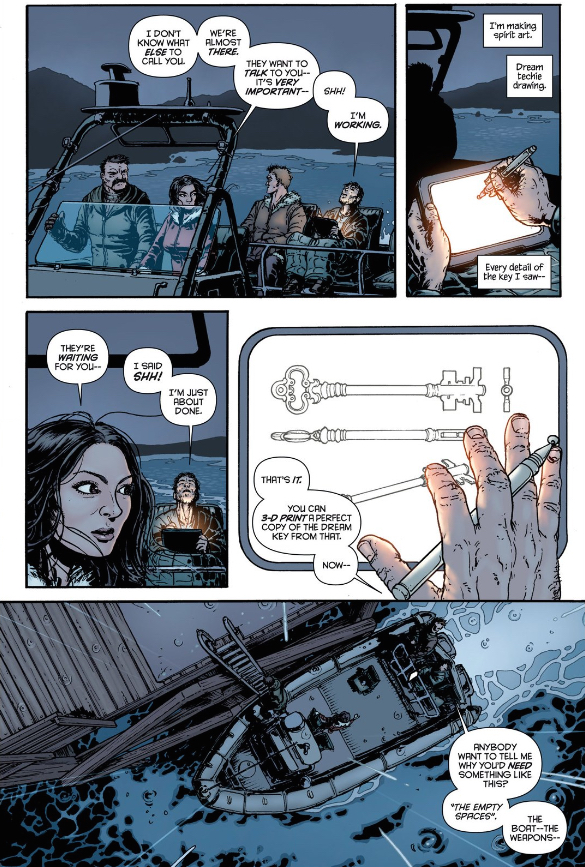 Morrison has always been a fan of mythology and eastern religions, so it’s no surprise that there’s this cross-section of Kabbalah and Mayan myth. With the little nuggets of both faiths that Morrison has provided thus far, our billionauts could end up finding the creator of the universe. Even if that is the case, don’t count on it being as straightforward as that. I predict even more “shit raining down” when we actually see Nameless as a fish out of water on the Moon the next issue. I enjoyed the start of this new series, but there didn’t seem to be enough characterization for Nameless. I mentioned Inception earlier — the “master dream thief” element, combined with the recruiting from an eccentric (and Asian) billionaire smells heavily of Inception. It’s not enough to ruin the experience, but it is worth pointing out.