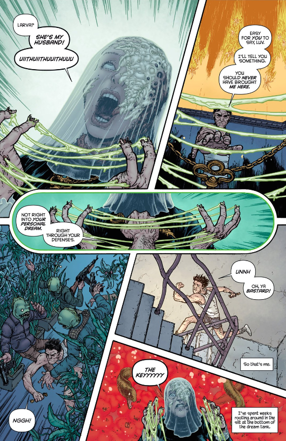 Man, I’ve been having a bad case of Monday morning quarterbacking lately, but I think the whole notion of dreams and controlling dreams has a similar storyteller-as-god metatext that we associate with The Sandman. Again, Burnham does some great work highlighting that theme in the art, which is downright dripping with panels within panels. Doorframes, windows, mirrors, the list goes on, but I think the most explicit ones are the ones bordering the Veiled Lady’s dream-space. That shit’s like a cube made out of comic panels. If that’s not a representation of what the inside of Grant Morrison’s head looks like, I don’t know what is.