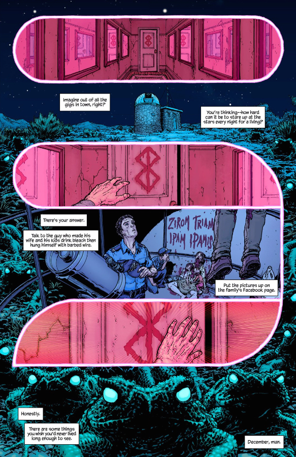 The issue opens with a shot of “The Door to the Anti-Universe” from Nameless’s perspective. Note that it’s set in a rounded rectangle. Burnham repeats that same set-up multiple times as Nameless approaches and opens the door, establishing the rounded rectangle as a shorthand for taking Nameless’s point-of-view.