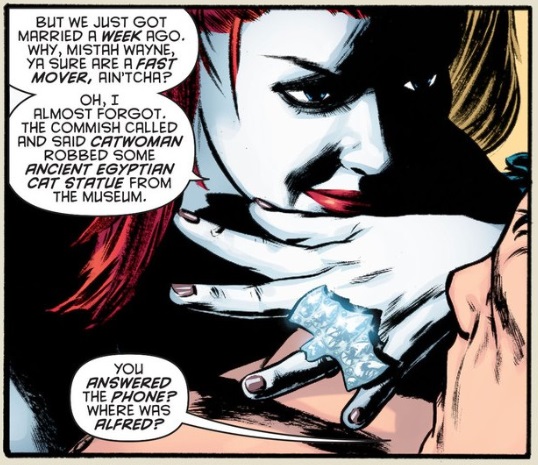 Patrick: Bruce’s bat-think bubbles were cute, and Harley’s blinged-to-shit engagement ring is flat out bonkers.
