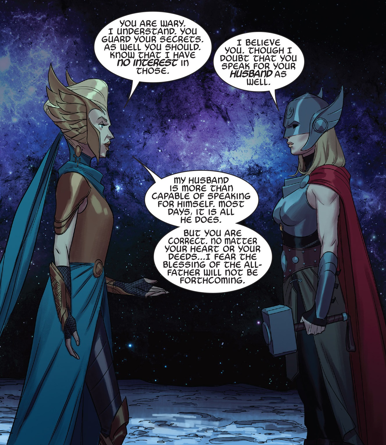 For Thor readers and characters, a lot of the conversation about the new Thor has been about the fact that she is a woman. At times it feels like this conversation is hijacking the larger story that Jason Aaron has planned, but it’s still a necessary conversation. Odin is the voice box for the establishment; it does help that he’s an ancient white dude in a position of power as a coincidence. Like many comic book fans, Odin is not pleased that the hammer and the mantle of Thor are now in the position of this “thieving sorceress.” Since Thor 1, Odin has been in the process of returning things “back to normal.” He’s ousted Freyja from her “All-Mother” role and now he’s on the hunt to take Mjolnir back from the new Thor. Odin is every old man standing in the way of progress; not entirely unlike the current House of Representatives. It’s like when the men all came home after WWII and wanted the women back in the kitchen. Odin wants to be 100% in control, and the fact that there is a woman flying around with Mjolnir calling herself Thor without his say-so is proof that he doesn’t have that control.