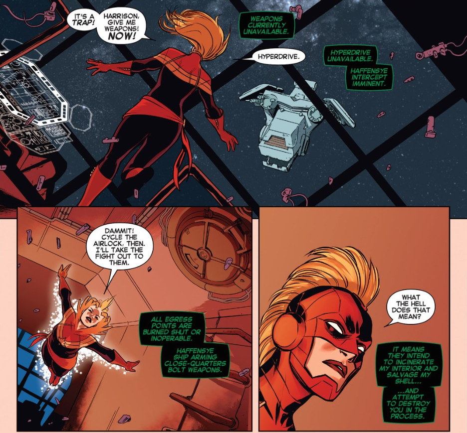 Finished with her adventure on Earth, Carol is dropped off back at her ship, only to discover it empty and in shambles. Apparently, Haffensye pirates boarded her ship to kidnap Tic and Chewie, and its now Carol’s duty to get them back before the Haffensye hurt them. Like I said, it’s about as straightforward a motivation as you can hope for, which frees up a lot of room for cleverness. Indeed, in the spirit of stripping things down, writers Kelly Sue DeConnick and Warren Ellis deliver one of the smarter spaceship battle scenes I’ve ever seen by simply tying Carol’s hands in basically every way she can.
