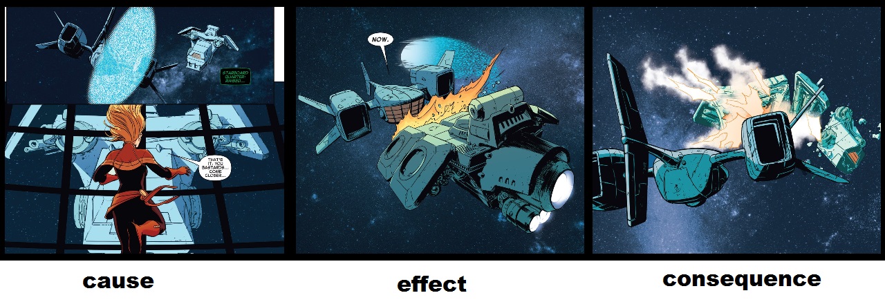 Lopez expands this simple idea with the shield swipe Drew mentioned above. The story of that move is told in three panels on consecutive pages. First the wind-up, then the swing, then the hit. There’s other business on those pages too, just to remind us of the human (and non-human!) players inside the spaceships that are duking it out, but it’s essentially the same story as Carol throwing that switch, told in the exact same way: cause, effect, consequence.