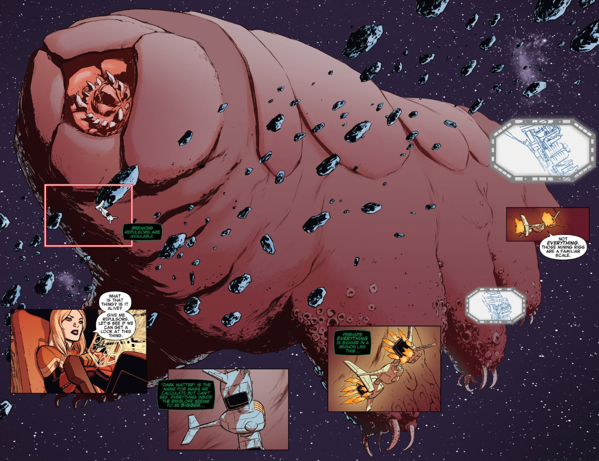 As Harrison slowly gets back online, Carol is left to devise a plan for recovering Tic and Chewie. With only herself and Harrison’s navigation system to guide her, Carol plots a course through “The Endless Envelope” in hopes of cutting off the pirates, but it turns out that was a terrible idea — apparently the Endless Envelope is a region of compacted space, such that it takes ten times longer to travel through. That’s a heady sci-fi concept to unload, but because this issue’s exposition load is otherwise pretty light, there’s plenty of space here to introduce it without feeling rushed or shoehorned. Obviously, my favorite detail is the giant waterbear Carol encounters.