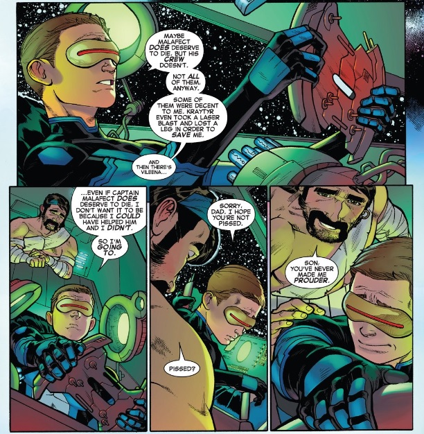 Again, Layman (through Corsair’s dialogue) makes it explicit that it’s Scott’s example that has helped Corsair reach this point, and it may be even more significant that Malafect seems willing to try as well. Scott’s heroism is touching even him, but it’s important to note that this isn’t a one way street — Scott’s learned as much from his father as Corsair has from him, and thankfully, that’s not a bad thing.