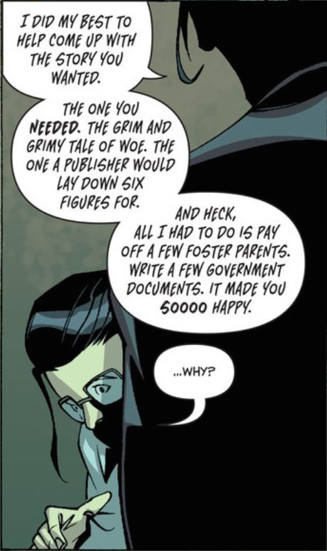 This is particularly significant for me, since my read of that detail suggested Snyder and Tynion’s opinion of Bill Finger’s role in Batman’s origin (“Liam” being the irish variant of “William”, and “Distal” is a term used to describe parts of limbs furthest from the center mass, like toes or fingers). That Distal played such a pivotal role in Batman’s in-universe origin was a tribute to the role Finger played in Batman’s real-world origin, but I was particularly intrigued at the lengths Snyder and Tynion wend to obfuscate this nod. Could such a tribute be subversive or even banned for a character whose every appearance still featured “created by Bob Kane” in the credits? In spite of Tynion and Snyder both assuring me that it was nothing so scandalous, I still had my suspicions (what can I say? It was an exciting theory!), but Joker’s assertion here that Liam Distal’s role was entirely fictional pretty well puts that theory to rest.