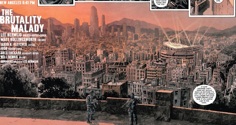 And there’s that copy — an almost comically evil “Welcome to New Angeles.” Bermejo’s not writing this thing with a scalpel, he’s writing it with a sledgehammer.