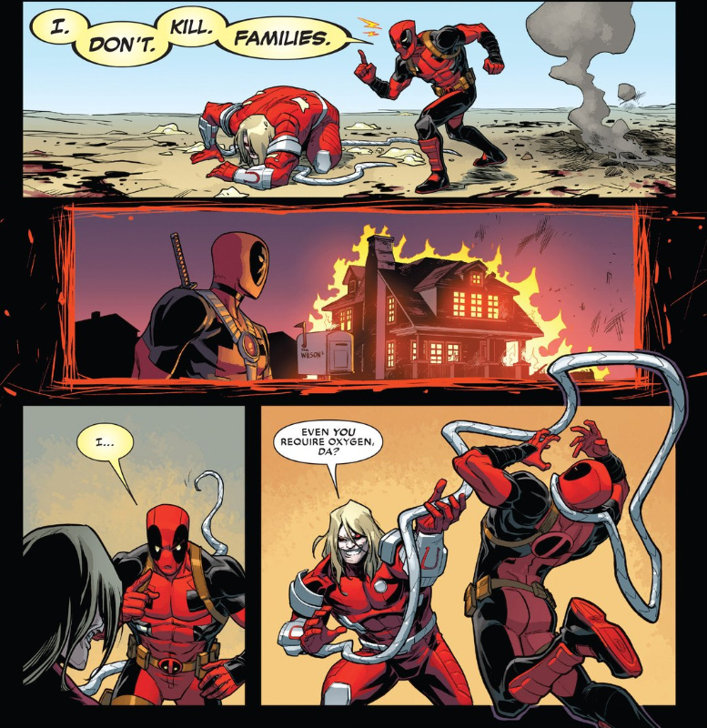 Drew: I know exactly what you mean, but I’m going to go with “good way.” It might be easy to read that Deadpool passage as a kind of apology for itself, with Kot distancing himself from the pop culture references, while failing to come up with anything better, but I think it works precisely because it’s Deadpool. Wade tends to make a lot of pop culture references AND break the fourth wall, so while this doesn’t quite do either in the same way, it certainly feels thematically tied to the character. To your point about disorientation, though: I love the constituent parts of this series enough to excuse some confusion as to how exactly they fit together.