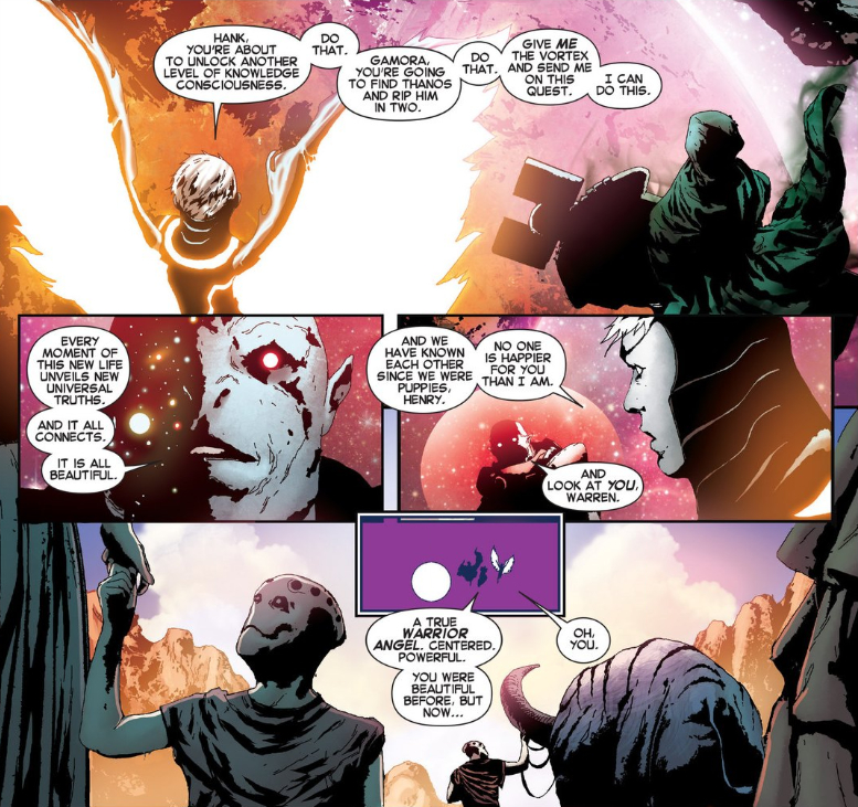 Sorrentino is such a weird pairing for the Black Vortex story. I love his work — and I love it in that issue too — but its such a singular style that it’s kind of jarring to have it inserted into a chapter of this Black Vortex saga. Like, this is going to read very strangely when it’s collected. All the other artists are playing in standard Marvel house style, but Sorrentino is just being Sorrentino.
