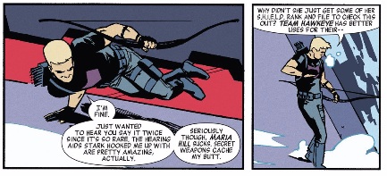 Clint has grown a lot from where he is in that flashback; young Clint is clearly Barney’s sidekick, but now he’s the senior partner of the Hawkeyes (although Kate may disagree). Still, Clint will always need someone to support him and worry about him, and Barney and Kate both play that role to the point where they have identical worries even decades apart (this also helps to characterize Kate as the more level-headed of the two). Clint’s grown a lot, sure, but some things never change.