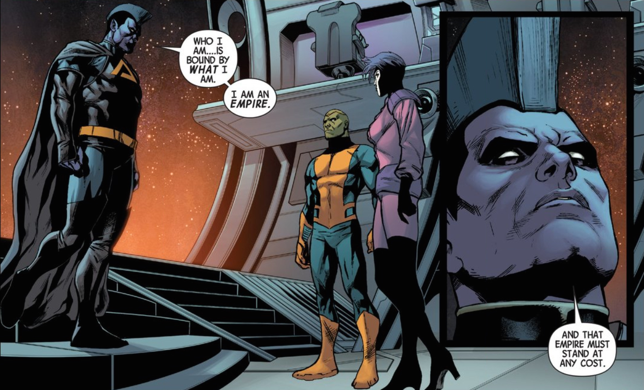 I think it’s equally informative to read Gladiator’s motivations in a similar light. I think your “every character is a comic book creator” reading is compelling, but I’m not sure Gladiator is quite the villain that you’ve made him out to be. Honestly, the fact that we see his version of “we have to kill billions to save trillions” as evil speaks to just how horrific the Illuminati’s actions have been. I mean, I get that planning to destroy Earth is kind of the evil comic book thing, but the Illuminati have been doing that on a semi-regular basis for over a year now. Hickman is simply pulling the camera back a bit, and showing how these actions might look if the Illuminati had been confronted with incursions anywhere but Earth. I don’t think Gladiator’s morality is really any different than that of the Illuminati — he just happens to value the lives of the rest of the universe over those of Earth.