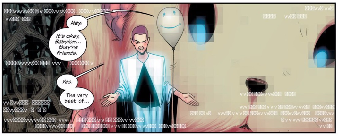 That’s a monstrous image, even for a series known for being particularly gruesome. Dragotta’s drawings of the “better place” that Babylon sees are just incredible, and love the digital noise that’s layered over it.