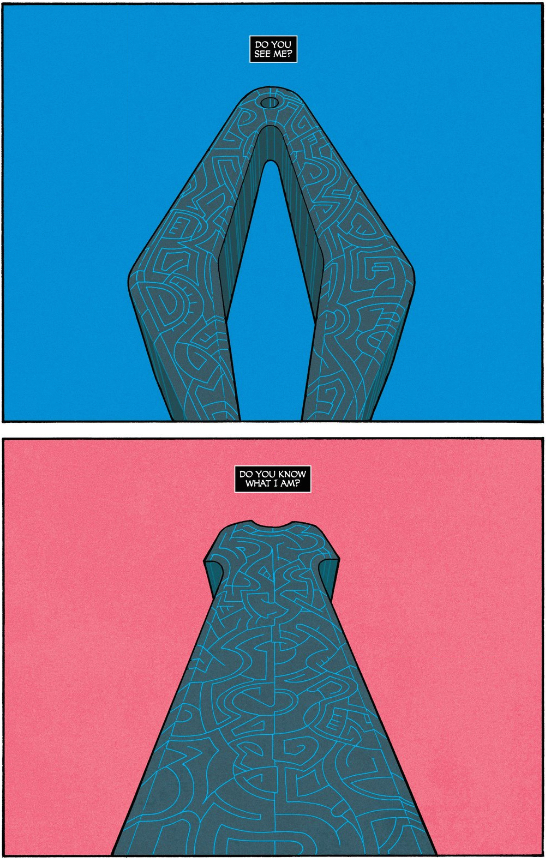 You don’t have to be Freud to pick up on the sexual imagery here (or colorist Jordie Bellaire’s cheeky inversion of the colors we associate with the respective genders), but — at least as far as this issue is concerned — they don’t seem to serve any purpose. Gender and sex play minimal roles here, and could hardly be considered themes this issue grapples with, let alone important ones. Kot may well be planting seeds for something down the road, but I’d like to suggest that it’s actually a red herring. Or, more precisely, it’s just there to keep us on our toes — phallic and yonic imagery may not be important going forward, but whetting our appetite for symbolic significance might be.