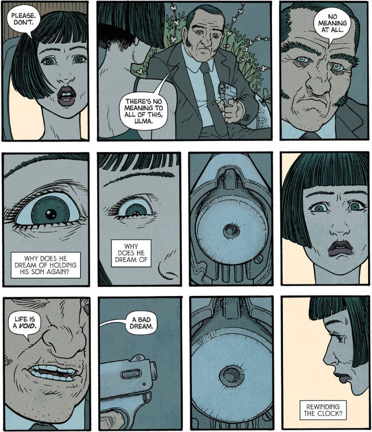 Actually, it seems entirely possible that Kot may be setting up a major meta-textual collision here. If the universe of The Surface is being projected by someone, and if the Surface itself gives people the ability to rewrite (or retcon?) their past, then could Mark, Gomez and Nasia eventually discover that the universe they inhabit is simply a story concocted by some guy named Ales Kot (or concocted by Doublehead, who was, in turn, dreamed up by Kot)? Or perhaps Kot is inviting us to question how real our universe really is? Are we responsible for our actions, or are they dictated by someone, be it family, society, God, or just some vague sense idea of fate and destiny?