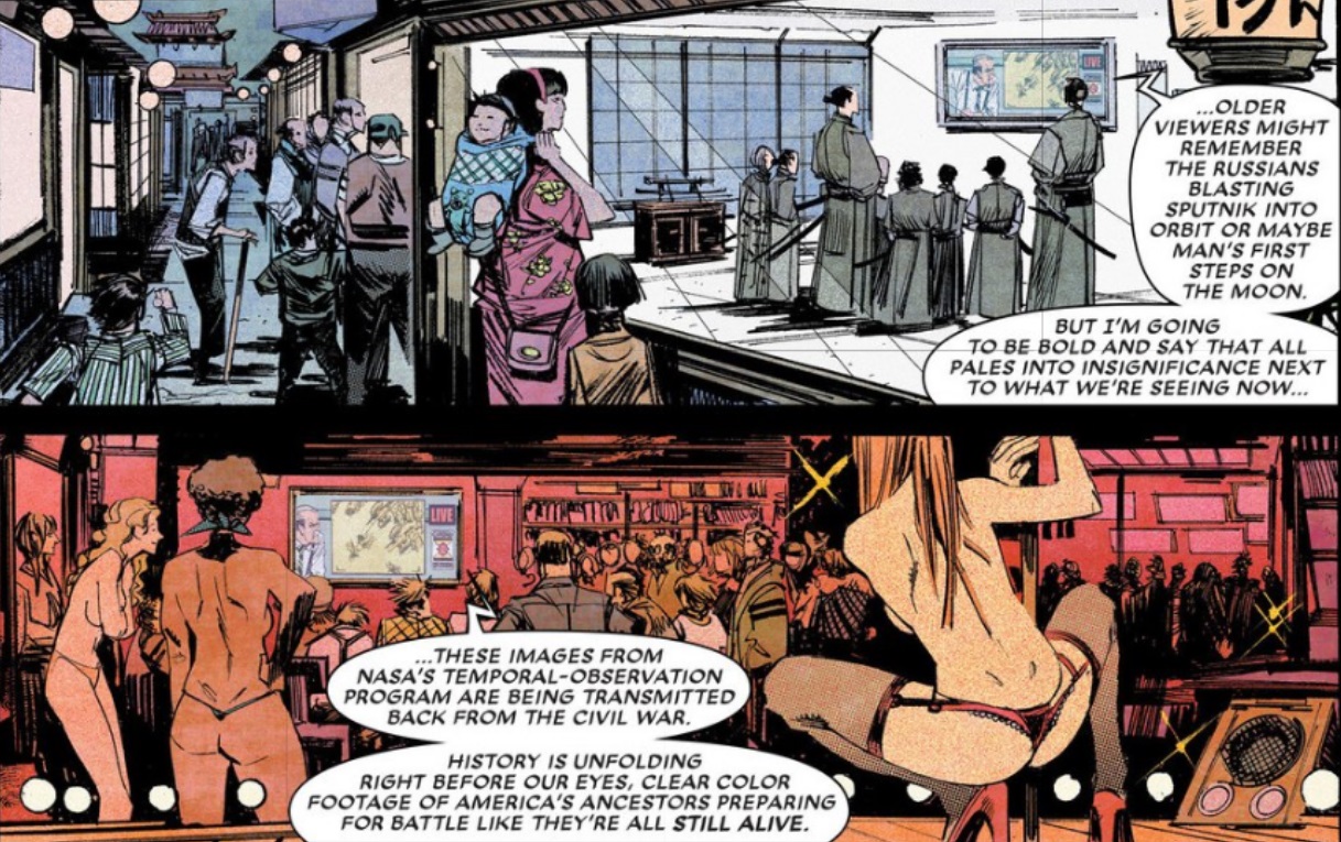 I’m more than satisfied with that endpoint, but as you suggest, Ryan, that comes at the expense of some pacing. I could see entire series built around the mysteries of anachronistic artifacts popping up where they shouldn’t, or even the geopolitics that would go into picking historical destinations (watching Columbus make landfall strikes me as a politically safe, but historically uninformative goal). This series obviously isn’t about either of those things (at least, not directly), so I’d say that the brisk pace does a great job of setting up a logline that appears to be “Bros in time.”