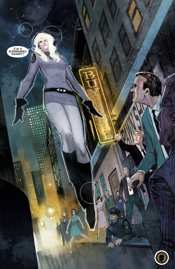 As for Radia herself, well, this may be a weird thing to say, but I can’t help but to think about Betty Draper. On more than one occasion I’ve described C.O.W.L. to people as “Mad Men with superpowers,” and Radia’s story in C.O.W.L. 9 has some strong parallels to Betty’s story in the first season episode “Shoot” (which, for those without an encyclopedic knowledge of Mad Men, is the one where Betty shoots those birds). Betty started out the series as a bored and passive housewife, and “Shoot” is the first time she gets a glimpse of a fulfilling life only to have it snatched away from her in the cruelest way possible; shooting those birds is the only way she has to take any control of her life, to show any agency whatsoever, after her crushing loss. It was a pivotal moment in Betty’s development, as it kickstarted her development from timid and passive to a stone-cold ice queen who gets things done. Betty needed to develop in this fashion to escape her horrid marriage, but in doing so, drove away everybody who was supposed to love her.