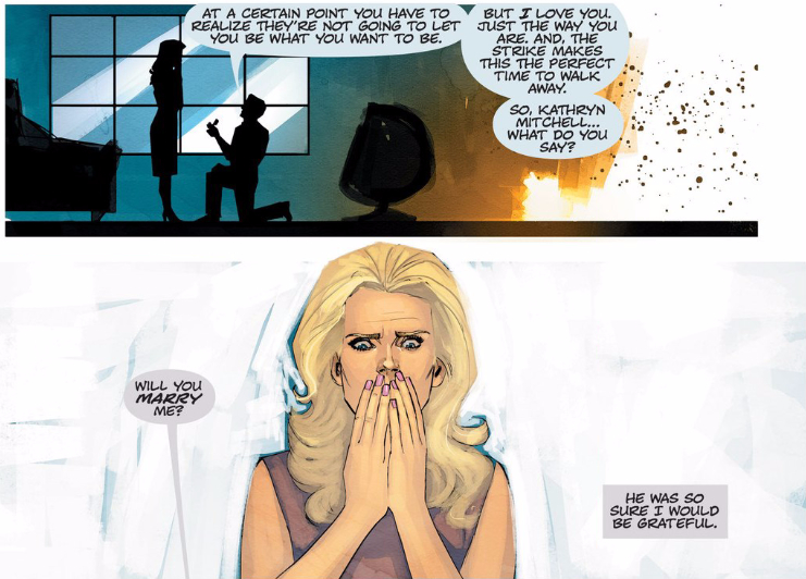 Earlier in the scene Reis establishes that this room is filled with candles, which could make it look like the candles are burning the color itself away in this first panel, but the truth is that it’s more an effect of David’s words striking a particularly harsh chord with Kathryn, to the point where they drain all color from her world. Reis’ acting in that last panel is fantastic — Kathryn is posed in the typical “overwhelmed by a proposal” gesture, but her expression makes it drastically clear that, if she’s overwhelmed, it’s not by pleasant emotions — as does the caption, which is actually being spoken by John Pierce’s widow on the next page but applies just as much to Radia. In both the art and the writing Higgins, Siegel and Reis make choices that aren’t always “realistic,” but which suit the tone of the story and the medium it’s being told in perfectly.