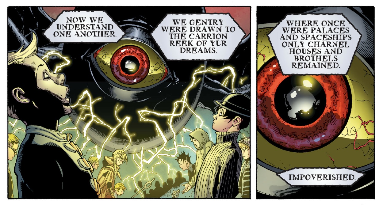He says that The Gentry was attracted to “the carrion of your dreams,” and how those dreams have become “charnel houses and brothels,” which apparently is a nice breeding ground for them. Morrison is saying that our society has lost its imagination and its drive to dream. I don’t think he means to be preachy necessarily, but it’s hard to argue with him in regards to the low-grade forms of entertainment we engage in and the various “toys and games” we distract ourselves with. I initially read that dialogue as a critique on America, but maybe it could also be applied to the current state of comics? Shitting on the industry and saying that there are no more good ideas is more of Alan Moore’s shtick, but I could see the merits of this argument as well. Whichever it is, I really dig the idea that we were once a world of idealists but we’ve let ourselves slip and are afraid to dream big.