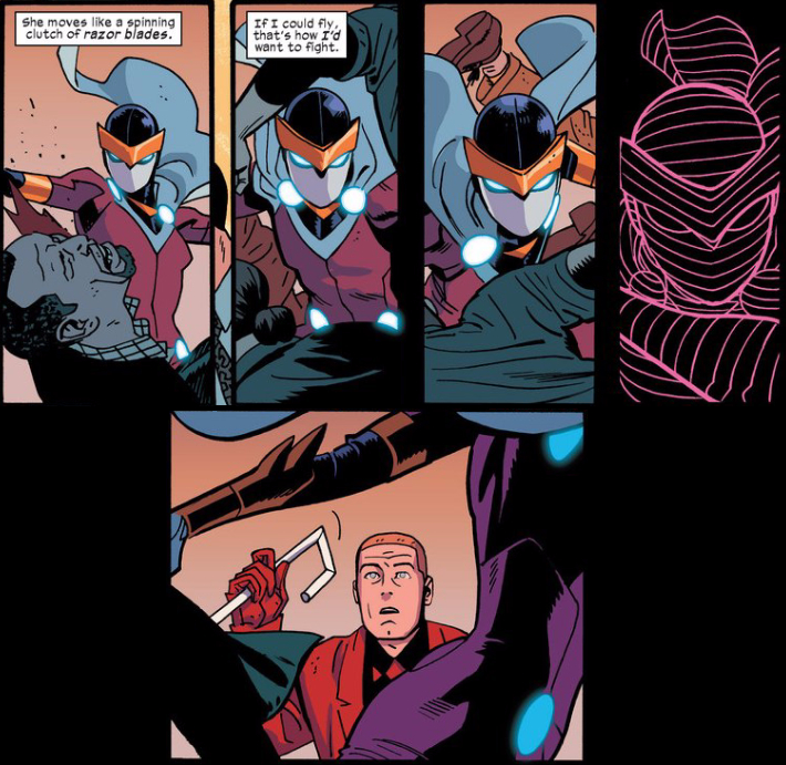 Ryan: While I can’t personally speak for Matt Murdock, I think he is earnestly impressed, maybe even taken aback- which says a lot. This is a man who has been carried from crisis to crisis by practically all of the flying Avengers, but it is young Ms. Pride here who garners the telling honor of his comment: “If I could fly, that’s how I’d want to fight.” This comes as high praise from someone with the agility beyond that of an Olympic-level gymnast.