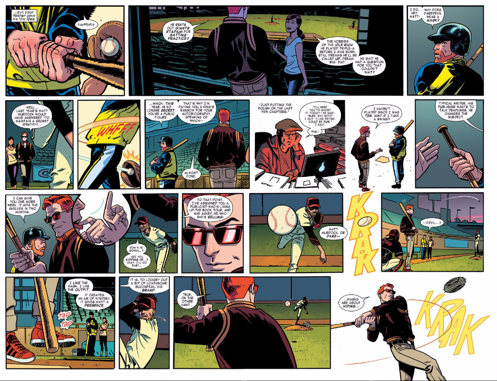 Much of this issue revolves around Daredevil’s new costume and the more public way of life it brings. Matt gets the idea from a discussion with his publisher, Wendell McDuffie, who asks why Daredevil wears a mask when his identity is public. Wendell, of course, is angling for a better “face” for Matt’s upcoming autobiography, but Matt is quite taken by the idea and the freedom it represents. The conversation plays out in the Giants Stadium, which Wendell has rented out for batting practice, and as they chat, Matt casually — and brilliantly — bats a few balls.