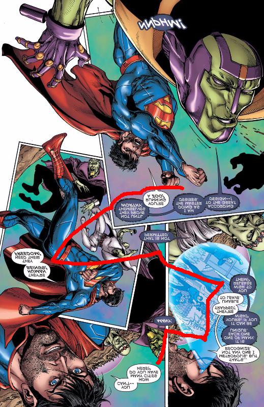 Spencer, I am struggling like hell not to be too negative about this issue, but I’m afraid that just doesn’t leave me with much to discuss. This is one boring, repetitive and ultimately dumb opening issue for an event that’s going to buoy DC’s entire line for the next two months. There’s no mystery in its ambiguity, only the dull thud of Brainaic repeatedly asking if Superman “has a city” (whatever the fuck that means). Maybe that’s why Supes gets frustrated and just starts throwing punches: he’s not intrigued, he’s just bored. And on the other side, it seems like Brainiac’s bored with the violence — notice how he doesn’t even stop his diatribe while reeling from this blow.